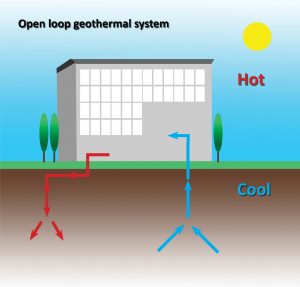 - Open systems extract water from the earth, use it to cool or heat the building via air conditioning equipment and then re-inject the water underground or discharge it into a water body.
