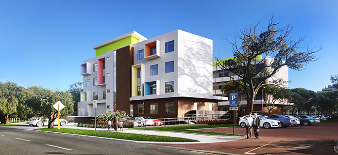 Ronald McDonald House is a newly constructed five-storey residential building that is intended to provide a “home away from home” environment for children and their families receiving treatment at the New Children’s Hospital. The building includes 47 units for families, commercial kitchen and laundry and communal lounge, dining and play areas and provides vital accommodation for families from rural and remote areas with children receiving life-saving treatment.